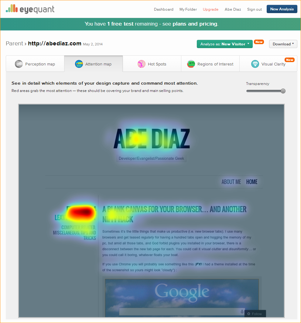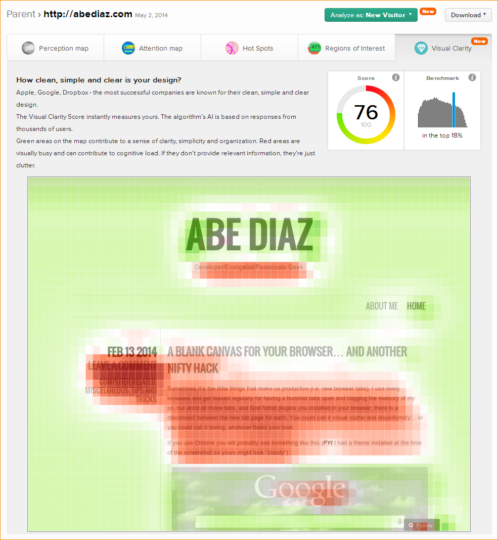 I recently ran into EyeQuant a neat tool to visualize how cluttered a website is. Here is an example of the attention map with my own blog:
